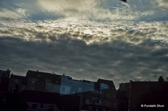 A dramatic sky over Belgium enroute to Brussels. Taken from inside the train hence the reflection