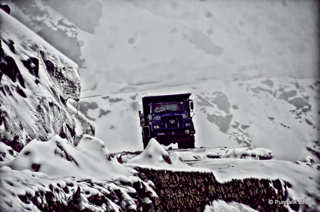 The slippery road of Khardungla pass are testing the skills of any driver and the snow makes it more difficult with a steep fall down the valley.