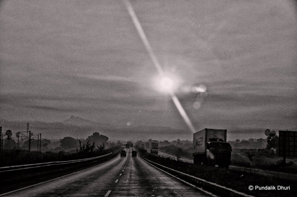 Tags: Black and White, Dawn, Mumbai-Pune Highway, Road, Sun
